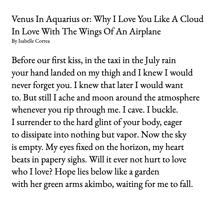 I’m working on a teeny tiny book of astrology love poems. I just wrote Sagittarius and Capricorn. Tonight, I plan to get weepy and dreamy and comfy at home to write Pisces and Cancer. Aquarius is my Venus sign and the first one I wrote in this series.