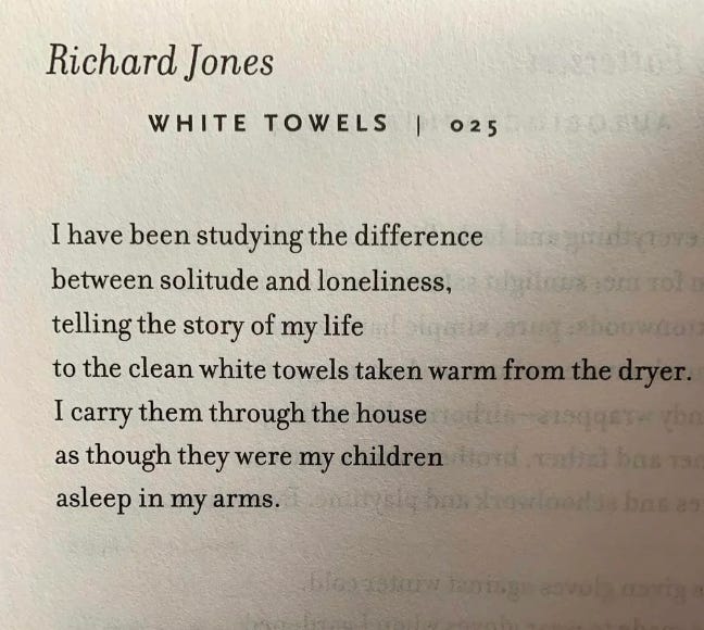 I used to write flash fiction primarily, and I’ve been thinking lately about the difference between poetry and fiction, really between poetry and everything else. My crude conclusion (crude because it’s Wednesday morning before 8 hours of meetings)(and conclusion because I’m feeling audacious) is that poetry does not f*ck around. It gets straight into the meaning of meaning. A poem about walking through your house holding white towels isn’t about white towels. It’s not even about solitude; it’s about solitudeness, the raw emotional statehood of solitude.