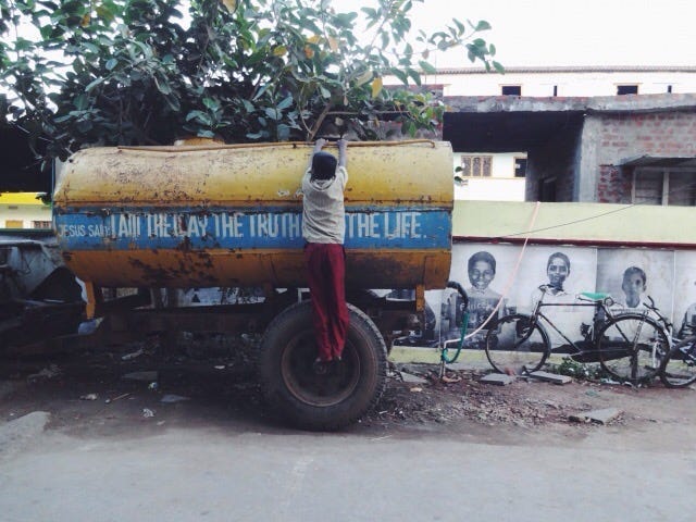 It’s a hundred and humid and I'm wearing leggings under a purple Punjabi dress tailored so tight that my chest is pressed down and my biceps are bulging; my collar bone hidden by a pink silk scarf. Two other teachers and I go to the central market. Crossing the street is a choreographed death wish and the three of us dance from mangos to bangles to coconut stands. I eat pani puri and watermelon, sweet and spicy liquid dripping off my chin.